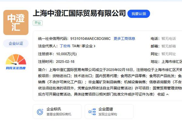 近日,上海中澄汇国际贸易有限公司成立,法定代表人为丁宏伟,注册资本1亿元,经营范围: 【一般项目】货物进出口;技术进出口;国内贸易代理;食用农产品零售;食用农产品批发;食品添加剂销售;畜牧渔业饲料销售;饲料添加剂销售;化工产品销售(不含许可类化工产品);非金属矿及制品销售;机械设备销售;信息咨询服务(不含许可类信息咨询服务);食品销...