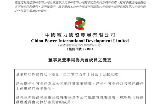 中国电力国际发展有限公司(简称:中国电力)近日公告称,由于其他工作安排,高平先生已辞任本公司执行董事、总裁,以及本公司风险管理委员会、战略与可持续发展委员会和执行委员会的成员职务,自2025年10月30日起生效。 自2025年10月30日起,赵永刚先生获委任为本公司执行董事兼总裁以接替高先生之职务。与此同时,赵先生已获委任接替高先生...