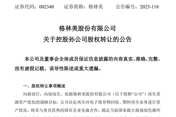 格林美股份有限公司(简称:格林美)公告称,近日,公司控股子公司江西格林循环产业股份有限公司(以下简称“格林循环”)与河南循环科技产业集团有限公司(下称“河南循环集团”)签署《关于江西格林循环材料有限公司100%股权之收购协议》,格林循环将其所持有的从事电子废弃物回收、塑料再生业务的全资子...