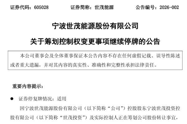 宁波世茂能源股份有限公司(简称:世茂能源)近日公告称,因公司控股股东宁波世茂投资控股有限公司(下称“世茂投资”)及实际控制人正在筹划公司股份转让事宜,该事项可能导致公司的控制权变更,公司的相关证券停复牌情况如下:图源:世茂能源公告 目前,世茂投资及实际控制人正在积极推动本次重大事项的各项工作,公司预计无法在2...