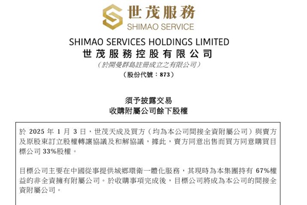 2025年1月3日,世茂服务控股有限公司发布《須予披露交易 收購附屬公司餘下股權》的公告。图源:世茂服务公告 公告称,世茂天成物业服务集团有限公司及上海栩茂锐企业管理有限公司(均为世茂服务间接全资附属公司)与深圳佳兄投资发展有限公司及原股东订立股权转让协议及和解协议,据此,佳兄投资同意出售而栩茂锐同意购买目标公司—&md...