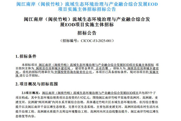 2025年1月3日,闽江南岸(闽侯竹岐)流域生态环境治理与产业融合综合发展EOD项目实施主体招标的招标公告发布。图源:中国招标公共服务平台公告 招标编号:CICOC-FJ-2025-001 1.招标条件 本招标项目闽江南岸(闽侯竹岐)流域生态环境治理与产业融合综合发展EOD项目实施主体招标项目组织主体为闽侯县住房和城乡建设局,建...