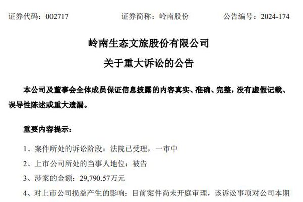12月21日,岭南生态文旅股份有限公司(简称:岭南股份)公告称,公司收到了广东省东莞市中级人民法院的《举证通知书》和《应诉通知书》,因金融借款纠纷被中国农业银行股份有限公司东莞东城支行起诉。原告要求岭南股份清偿金单债务本金和支付利息,并要求其他被告承担连带清偿责任。此次涉案金额合计2.98亿元。 据悉,2021年1月,岭南股份与中国...