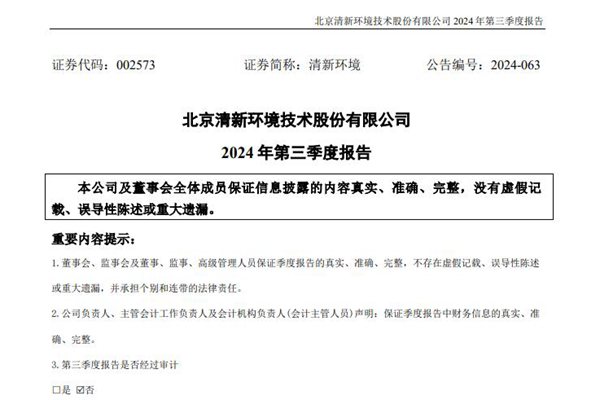 北京清新环境技术股份有限公司 (简称:清新环境)近日《2024 年第三季度报告》,前三季度共实现营收约58.85亿元,同比减少1.59%;归属于上市公司股东的净利润约5944万元,同比减少77.34%;基本每股收益0.0423元,同比减少76.86%。图源:清新环境公告 清新环境成立于2001年,现为四川发展(控股)公司旗下国有控股...