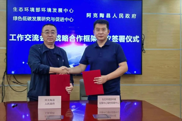 2024年9月27日,生态环境部环境发展中心绿色低碳中心与阿克陶县人民政府在北京签署《生态环境部环境发展中心绿色低碳中心与阿克陶县人民政府签署共同推进带绿色发展中发挥示范作用战略合作协议》。阿克陶县副县长王宏毕,生态环境部环境发展中心绿色低碳中心主任周长波出席签约仪式并讲话。周长波和王宏毕分别代表双方签署协议。 周长波代表生态环境部...