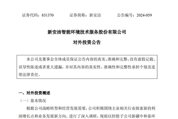 新安洁智能环境技术服务股份有限公司(下称 “新安洁”)10月9日发布《对外投资公告》。 公告显示,新安洁根据公司战略转型和经营发展需要,现拟以控股子公司新疆中和泰环保技术有限公司(以下简称“中和泰”)为主体,在新疆投资建设油基岩屑资源化利用项目,项目拟投资 11,000 万元,分两期投...