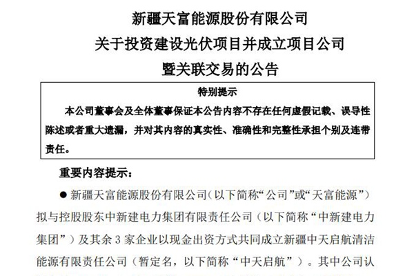 2024年10月10日,新疆天富能源股份有限公司同时公告,成立2家项目公司。 新疆中天昆仑新能源有限责任公司(暂定,以市场监督管理部门最终核定为准) 新疆天富能源股份有限公司拟以现金出资方式与新疆昆仑投资集团有限公司共同成立项目公司建设运营草湖项目区 5.4MW 分布式光伏项目,新公司注册资本为 400 万元,其中:天富能源出资 ...
