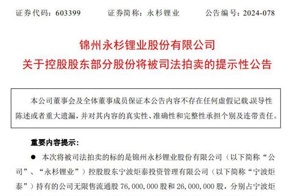 10月9日,锦州永杉锂业股份有限公司(简称:永杉锂业)公告称,公司控股股东宁波炬泰投资管理有限公司(下称“宁波炬泰”)持有的76,000,000 股股份将于10 月 31 日 10 时- 11月 1 日 10 时进行公开拍卖; 26,000,000 股股份将于10 月 31 日 10 时- 11月 1 日 10...