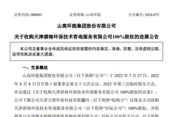 山高环能集团股份有限公司(简称:山高环能)公告称,公司于9月29日召开第十一届董事会第十五次会议,审议通过《关于签订〈股权转让协议之补充协议〉的议案》,就天津碧海环保技术咨询服务有限公司(下称“天津碧海环保”或“目标公司”)在收购期间内的部分条款进行优化。本次事项不构成关联交易,亦不构成...