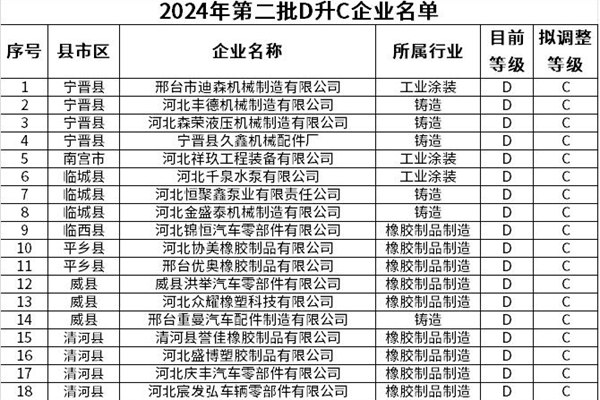 关于2024年邢台市重污染天气重点行业企业绩效分级第二批D升C企业的公示 根据省生态环境厅《河北省重点行业绩效分级管理实施方案》(冀环大气〔2021〕169号)和《邢台市重污染天气重点行业企业绩效分级管理办法实施细则(试行)》(邢环字〔2021〕43号)的规定,经市、县两级核查,我市河北丰德机械制造有限公司等31家企业符合对应行业C级标...