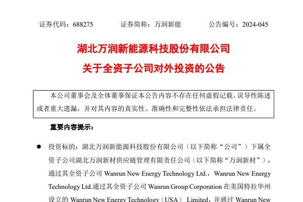 9月23日,湖北万润新能源科技股份有限公司(简称:万润新能)发布《关于全资子公司对外投资的公告》,下属全资子公司万润新材通过旗下瑞世达科技有限责任公司(简称“项目公司”),开展“万润新能美国新能源正极材料及其产业化研发中心项目”。 据介绍,项目公司将总规划建设年产5万吨磷酸铁锂,分期开...