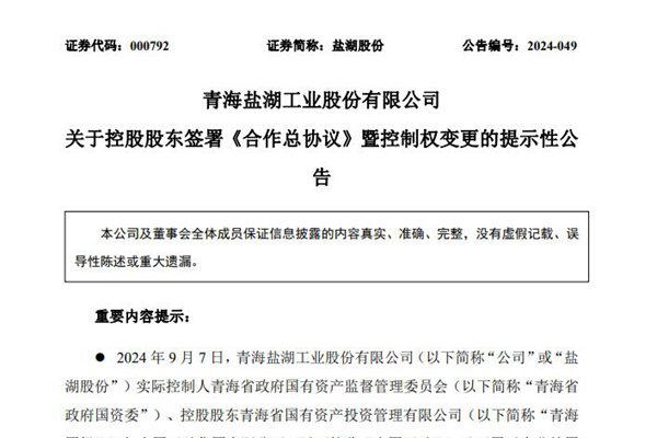 9月8日晚间,青海盐湖工业股份有限公司(简称:盐湖股份)公告称,公司实际控制人青海省国资委、控股股东青海省国有资产投资管理有限公司(下称“青海国投”)与中国五矿集团有限公司(下称“中国五矿”)及下属子企业签署了《关于组建中国盐湖集团合作总协议》。 协议约定主要包括两部分: 一是,青海...