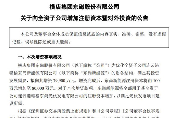 2024年7月27日,横店集团东磁股份有限公司发布《关于向全资子公司增加注册资本暨对外投资的公告》,拟向连云港赣榆东尚新能源有限公司增资 79,900 万元。 对于本次增资款项,东尚新能源将全部用于其全资子公司连云港赣榆东尚光伏发电有限公司的注册资本增加,以满足光伏发电项目建设所需。 公告显示,截止 2023 年 12月 31 日...