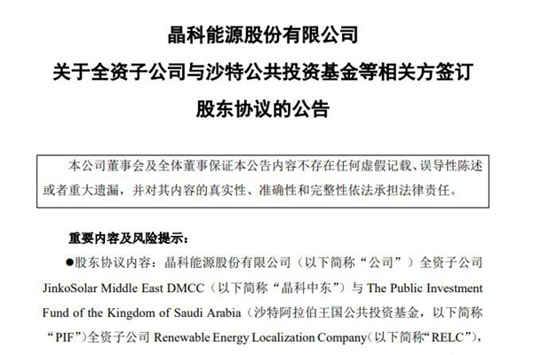 晶科能源股份有限公司发布《关于全资子公司与沙特公共投资基金等相关方签订股东协议的公告》。 公告显示,晶科能源股份有限公司全资子公司JinkoSolar Middle East DMCC(晶科中东)与 The Public InvestmentFund of the Kingdom of Saudi Arabia(沙特阿拉伯王国公共投...