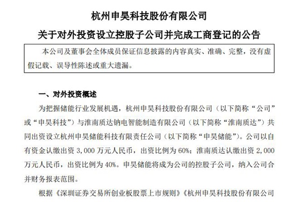 2024年7月11日,杭州申昊科技股份有限公司发布关于对外投资设立控股子公司并完成工商登记的公告。 杭州申昊科技股份有限公司与淮南质达钠电智能制造有限公司共同出资设立杭州申昊储能科技有限责任公司。 对外投资的目的:在国家大力支持储能行业发展的政策背景下,公司投资设立申昊储能从事包 括户储、工商业储能、电网侧储能等业务,拟研发虚拟电...