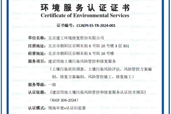 近日,建工修复通过中环协(北京)认证中心“建设用地土壤污染风险管控和修复服务认证”,认证服务等级为一级,证书编号2024-001,成为通过一级认证的环境修复从业单位。 中环协 ( 北京 ) 认证中心是中国环境保护产业协会组建 , 经原国家环境保护总局和国家认证认可监督管理委员会批准成立的专业环境类认证机构。建...