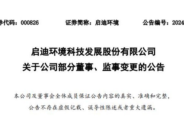 4月24日,启迪环境科技发展股份有限公司(简称:启迪环境)发布《关于公司部分董事、监事变更的公告》,表示董事会近日收到白刚先生提交的书面辞职报告,白刚先生由于个人原因辞去公司董事、执行总经理职务。 公告显示,在4月23日,启迪环境召开2024年第三次临时股东大会,同意选举畅敞先生为公司第十届董事会董事,畅敞先生具备履行董事职责的任职...