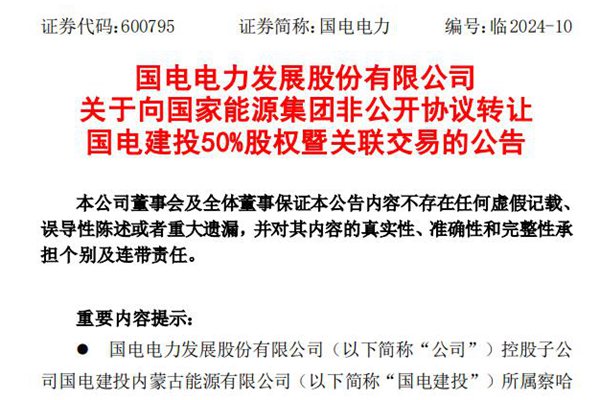 4月16日,国电电力发展股份有限公司(简称:国电电力)发布公告称,为降低察哈素煤矿复产时间不确定性对公司带来的持续影响,提高公司资产质量及盈利能力,公司拟向控股股东国家能源投资集团有限责任公司全资子公司国家能源集团西部能源投资有限公司(下称“西部公司”),非公开协议转让公司持有的国电建投内蒙古能源有限公司(下称...