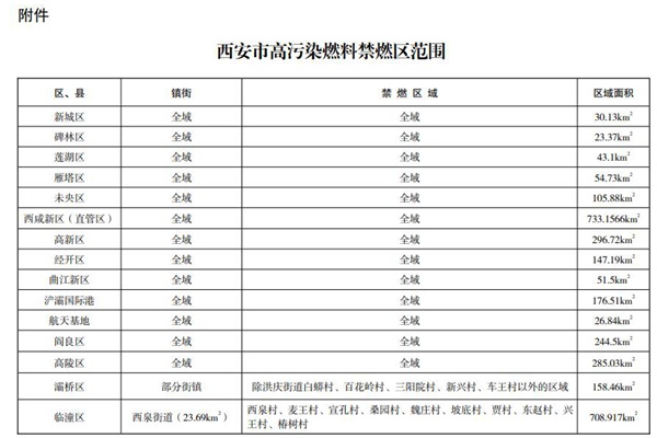 西安市人民政府关于调整高污染燃料禁燃区范围的通告 为进一步加强大气污染防治,推动环境空气质量持续改善,保障人民群众身体健康。根据《中华人民共和国大气污染防治法》《陕西省大气污染防治条例》和《西安市大气污染防治条例》有关规定,市政府决定,调整我市高污染燃料禁燃区(以下简称禁燃区)范围。现就有关事项通告如下: 一、禁燃区定义 禁燃区是市...