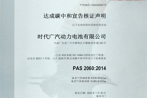 日前,时代广汽正式获得SGS出具的PAS2060碳中和认证证书,成功跻身零碳工厂行列。(PAS2060碳中和认证证书) 时代广汽作为新能源动力电池企业,始终践行绿色能源驱动未来,为美好的生活和社会进步贡献力量的企业使命,积极响应国家“双碳”战略,将“碳中和”融入企业发展长期战略,在各环...