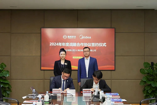 2024年2月22日,美的集团与通威股份在通威国际中心共同举行2024年年度战略合作协议签约仪式。双方将在光伏行业数字化、机器人、物流自动化、智慧楼宇、物流服务等领域展开全面深度的合作。图源:美的集团 美的集团合康新能光伏副总经理梁华栋、通威股份光伏商务部组件全球营销总经理邱新代表双方签署战略合作协议。美的集团企业业务总裁王新亮,通...