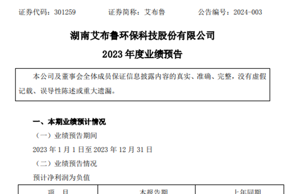 致力于处理解决农业农村污水、固废、土壤污染及生态问题的湖南艾布鲁环保科技股份有限公司近日发布《2023年度业绩预告》,业绩预告情况如下: 报告期内,归属于上市公公司股东的净利润亏损1900万元-2500万元;扣除非经常性损益后的净利润亏损2200万元-2800万元。 艾布鲁表示,本报告期业绩变动的原因有三方面: 1、本报告期内,...