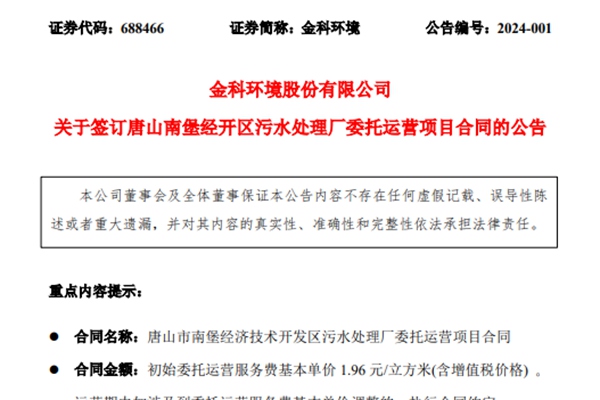 近日,金科环境股份有限公司发布有关签订唐山南堡经开区污水处理厂委托运营项目合同的公告,公告显示,项目初始委托运营服务费基本单价 1.96 元/立方米。运营期内如涉及到委托运营服务费基本单价调整的,执行合同约定。 合同自签订之日起生效,期限27年。项目设计水量为年度日均14万吨。金科环境表示,该项目合同的签订有利于进一步提升公司影响力...