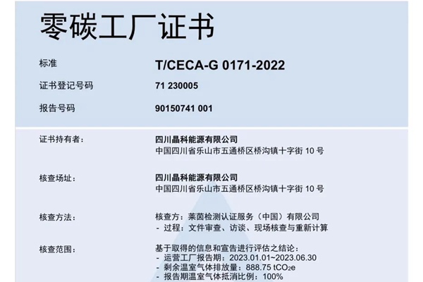 近日,光伏企业晶科能源宣布,公司凭借先进的绿色经营实践通过了《零碳工厂评价规范》标准评估,正式获得“零碳工厂”认证。这代表着国家认证机构对于公司社会责任感与环保意识的高度认可,标志着晶科能源在企业可持续发展、节能减排及环保建设方面迈向了又一新高度,同时也为新时期绿色工厂的创建提供了榜样力量。 零碳工厂 《零...