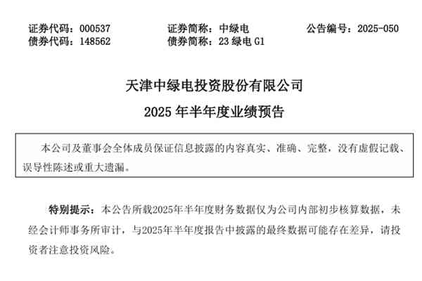 天津中绿电投资股份有限公司(简称:中绿电)近日发布《2025年半年度业绩预告》。报告期内,中绿电预计实现归属于上市公司股东的净利润盈利55,901.64万元-75,631.64万元,同比增长20.27%-62.72%;扣除非经常性损益后的净利润盈利55,829.30万元-75,533.76 万元,同比增20.23%-62.66%;基本...