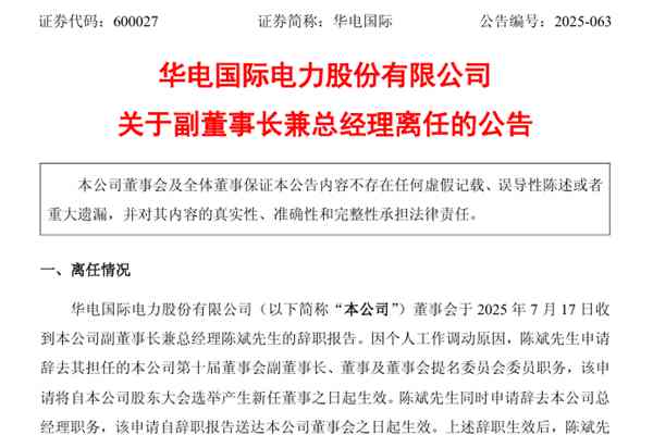 华电国际电力股份有限公司(简称:华电国际)公告称,因个人工作调动原因,陈斌先生申请辞去其担任的本公司第十届董事会副董事长、董事及董事会提名委员会委员职务,该申请将自本公司股东大会选举产生新任董事之日起生效。陈斌先生同时申请辞去本公司总经理职务,该申请自辞职报告送达本公司董事会之日起生效。上述辞职生效后,陈斌先生不再担任本公司的任何职务...