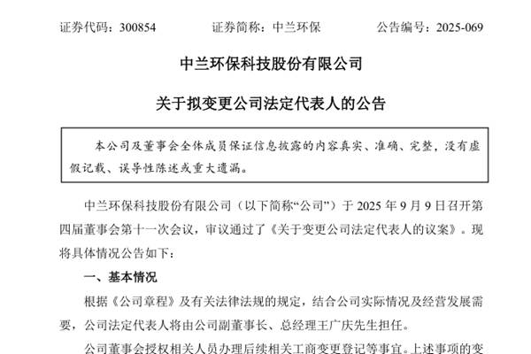 中兰环保科技股份有限公司(简称:中兰环保)近日公告称,根据《公司章程》及有关法律法规的规定,结合公司实际情况及经营发展需要,公司法定代表人将由公司副董事长、总经理王广庆先生担任。公司董事会授权相关人员办理后续相关工商变更登记等事宜。上述事项的变更最终以市场监督管理部门的核准结果为准。 中兰环保表示,此次变更不会导致公司所属行业发生变...