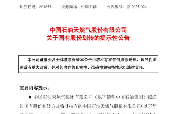 中国石油天然气股份有限公司(简称:中国石油)近日发布《关于国有股份划转的提示性公告》。公告显示,中国石油天然气集团有限公司(下称“中国石油集团”)拟通过国有股份划转方式将其持有的541,202,377 股A股股份(占公司总股本的0.30%1)划转给中国移动通信集团有限公司(下称“中国移动集团&rdq...