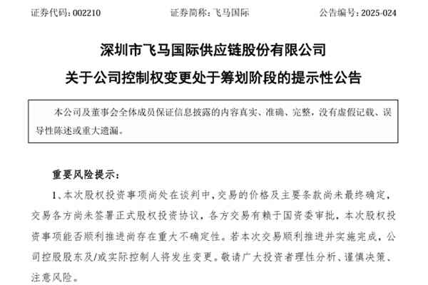 深圳市飞马国际供应链股份有限公司(简称:飞马国际)公告称,公司于6月23日收到间接控股股东新希望投资集团有限公司(下称“新投集团”)发来的《告知函》,主要内容如下: 新投集团已经与漳州高新区高鑫创业投资合伙企业(有限合伙)(下称“投资方”)、海南宝晶利科技有限公司、新增鼎(海南)投资发...