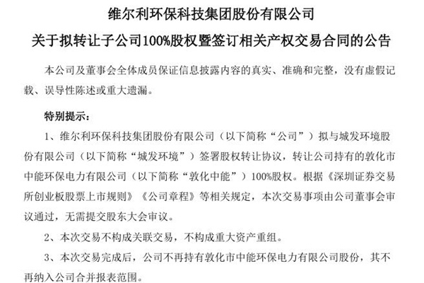 2025年05月19日,维尔利环保科技集团股份有限公司发布《关于拟转让子公司100%股权暨签订相关产权交易合同的公告》。图源:维尔利公告 维尔利通过常州产权交易所公开挂牌方式转让公司全资子公司敦化市中能环保电力有限公司100%的股权,确认竞买人城发环境股份有限公司。 维尔利拟与城发环境签订《关于维尔利环保科技集团股份有限公司持有敦化...