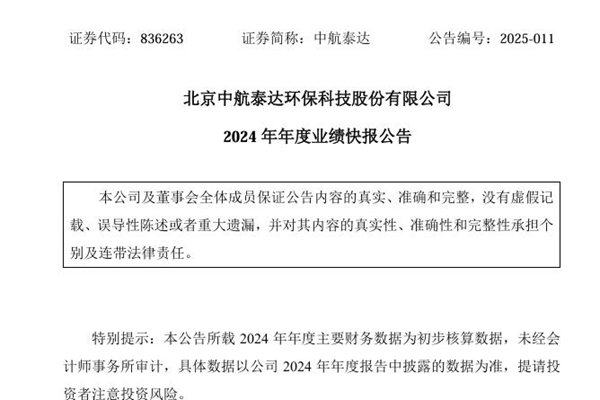 北京中航泰达环保科技股份有限公司(简称:中航泰达)近日发布《2024 年年度业绩快报公告》。快报显示,中航泰达2024年实现营业收入3.55亿元,上年同期4.73亿元,同比下降24.97%。利润总额6161万元,上年同期为8715万元,同比下降29.31%。归属于上市公司股东的净利润为5829万元,上年同期为8811万元,同比下降33...