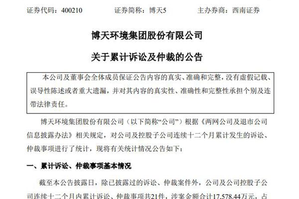博天环境集团股份有限公司(证券简称:博天5,下称“博天环境”)2月10日发布《关于累计诉讼及仲裁的公告》。截至本公告披露日,博天环境及其控股子公司连续十二个月内累计诉讼、仲裁事项共21件,涉案金额合计17,578.44万元,占公司最近一期经审计净资产的10.24%。其中,单笔涉案金额1,000万元(含)以上的诉...