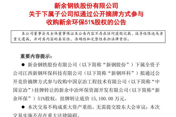 2025年01月02日,新余钢铁股份有限公司发布《关于下属子公司拟通过公开摘牌方式参与收购新余环保51%股权的公告》。图源:新钢股份公告 公告称,下属全资子公司江西新钢环保科技有限公司拟通过公开竞价摘牌方式参与收购中国京冶工程技术有限公司挂牌转让的新余中冶环保资源开发有限公司51%股权,挂牌转让底价15,100.00万元。若成功摘牌...