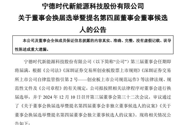 2024年12月11日,宁德时代新能源科技股份有限公司发布《关于董事会换届选举暨提名第四届董事会董事候选人的公告》。图源:宁德时代公告 公告显示,宁德时代第四届董事会由9名董事组成,其中独立董事3名。经公司第三届董事会提名委员会对董事候选人任职资格进行审查,董事会同意提名第四届董事会非独立董事候选人如下:曾毓群先生、李平先生、周佳先...