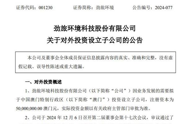 劲旅环境科技股份有限公司(简称:劲旅环境)近日公告称,因业务发展的需要,公司拟于中国澳门特别行政区(以下简称“澳门”)投资设立子公司,注册资本为50,000,000.00 澳门元,实际投资金额以有关政府主管部门审批为准。新公司将由劲旅环境持有 70%股权,罗志豪持有 30%的股权,经营范围或主营业务:城市清洁及...
