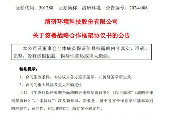 清研环境科技股份有限公司(简称:清研环境)近日近日公告称,公司与怀化市产业投资集团有限公司、仁天环保科技有限责任公司在怀化产投集团总部签署了《战略合作框架协议》。三方将在固废资源化利用、流域环境综合治理、环保先进技术研发、高端装备制造产业投资等多个领域展开深入合作,共同构建怀化市生态环境领域全产业链、全生命周期产业体系,助力怀化生态友...