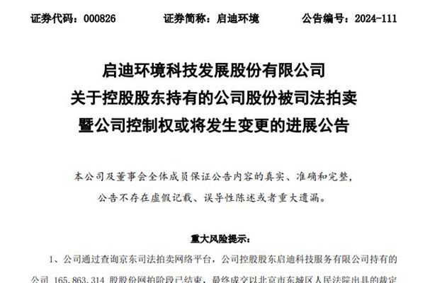 启迪环境科技发展股份有限公司(简称:启迪环境)12月4日发布《关于控股股东持有的公司股份被司法拍卖暨公司控制权或将发生变更的进展公告》。目前,启迪环境控股股东启迪科技服务有限公司持有的公司 165,863,314 股股份网拍阶段已结束,最终成交以北京市东城区人民法院出具的裁定为准。该部分股份目前尚未过户完成。 若本次股份拍卖全部过户...