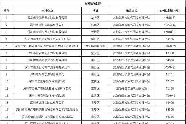 深圳市生态环境局关于2024年第五批大气环境质量提升补贴资金拟补贴项目审查结果公示 根据《深圳市大气环境质量提升补贴办法(2022-2025年)》要求,现将2024年第五批通过审查的深圳市中油新田加油站有限公司、深圳市沙盐加油站有限公司和深圳市中油悦凯加油站有限公司等单位加油站三次油气回收治理补贴项目予以公示。公示期为2024年11月2...