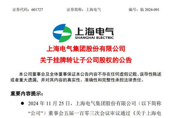 上海电气集团股份有限公司(简称:上海电气)近日公告称,公司将通过上海联合产权交易所公开挂牌转让所持上海电气集团(肃宁)环保科技有限公司(以下简称“肃宁公司”或“标的企业”)100%股权,挂牌价格为 2024 年 3 月 31 日肃宁公司股东全部权益价值评估值人民币 15,700 万元(最...