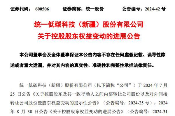 统一低碳科技(新疆)股份有限公司(简称:统一股份)近日公告称,公司控股股东深圳市建信投资发展有限公司(以下简称“深圳建信”)在上海联合产权交易所公开挂牌对外转让其所持新疆昌源水务集团有限公司(以下简称“昌源水务”)51%股权,即对外间接转让昌源水务下属子公司新疆融盛投资有限公司所持统一股...