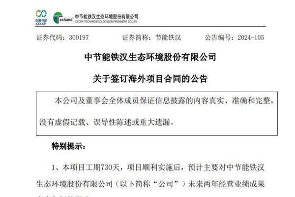 中节能铁汉生态环境股份有限公司(简称:节能铁汉)11月11日盘后公告称,公司近日收到了迪拜分公司作为承包商与普莱斯特海滨房地产开发有限责任公司(PRESTIGE THE SEASIDE REAL ESTATEDEVELOPMENT L.L.C)(以下简称:“雇主”)以及SG控股有限公司(SGHOLDINGS L...