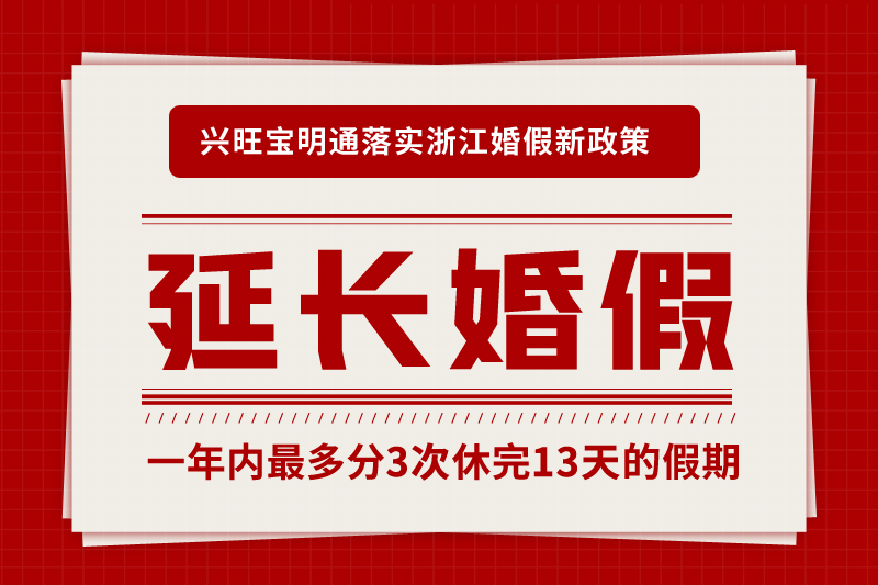 我单方面宣布,兴旺宝明通这波赢麻了!前脚《浙江省婚假规定》刚刚颁布,兴旺宝就跟上了,一点不带拖泥带水的。整整13天婚假!它这就来了,即刻实施! 即日起,兴旺宝员工可凭借结婚证明,在结婚登记日起的一年内,取用这13天婚假,而且允许最多分三次取用!让我看看是谁还攒着婚假没请?还有未婚的小伙伴们,这不赶上好时候了嘛~ 另外,已休婚假的宝...