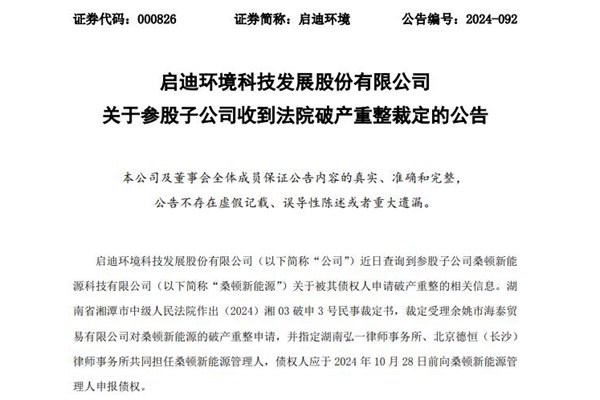 启迪环境科技发展股份有限公司(简称:启迪环境)9月24日公告称,公司已经查询到参股子公司桑顿新能源科技有限公司(下称“桑顿新能源”)被其债权人申请破产重整的相关信息。根据湖南省湘潭市中级人民法院作出的民事裁定书,裁定受理余姚市海泰贸易有限公司对桑顿新能源的破产重整申请,债权人应于10月28日前向桑顿新能源管理人...