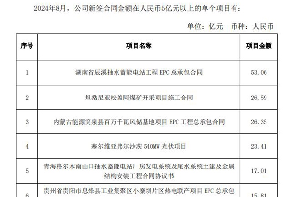 9月24日,中国电力建设股份有限公司发布2024 年 1 月至 8 月主要经营情况公告。图源:中国电力建设股份有限公司公告 公告显示,中国电建8个月新签项目数量合计6259个,金额7647.44亿元,同比增长7.05%。其中,水资源与环境,城市建设与基础设施新签均同比下降,而能源电力新签项目3621个,合同金额4516.43亿元,同...