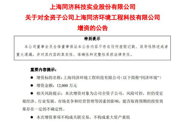 2024年9月18日,上海同济科技实业股份有限公司发布《关于对全资子公司上海同济环境工程科技有限公司增资的公告》。 公告表示,本次增资金额为12,000 万元,是为了进一步优化同济环境资本结构,提升其资本实力,满足其可持续发展的需要,有利于促进公司绿色低碳环保业务的发展。 公告称,本次增资后,同济环境仍为公司全资子公司,公司合并报...