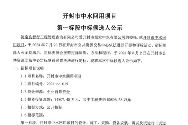 开封市中水回用项目第一标段中标候选人以及第二标段中标候选人已经于2024年8月2日公示,项目投资总额74807.48万元,其中工程费约60806.58万元。 第一标段是开封市中水回用项目工程总承包,中标候选人:中铁十局集团有限公司(牵头人)、重庆设计集团有限公司联合体(成员)。 建设内容: 1)开封市东区污水处理厂中水回用部分:...